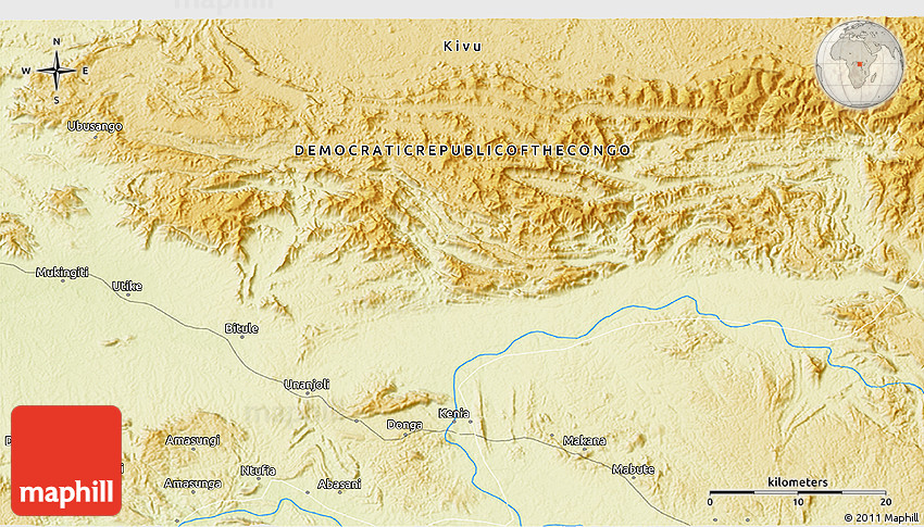 The 3D physical map represents one of many map types and styles available. Look at Donga, Lubutu, Maniema, Kivu, Democratic Republic of the Congo from different perspectives.