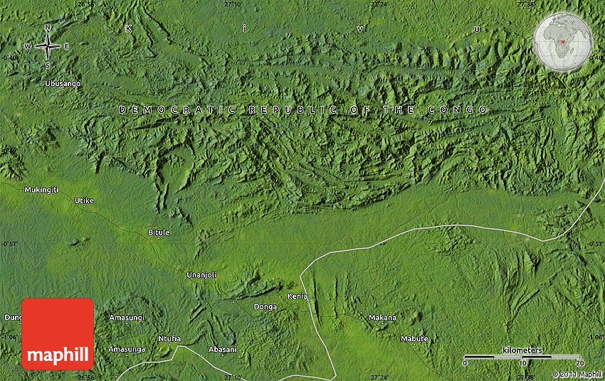 The flat satellite map represents one of many map types available. Look at Donga, Lubutu, Maniema, Kivu, Democratic Republic of the Congo from different perspectives.