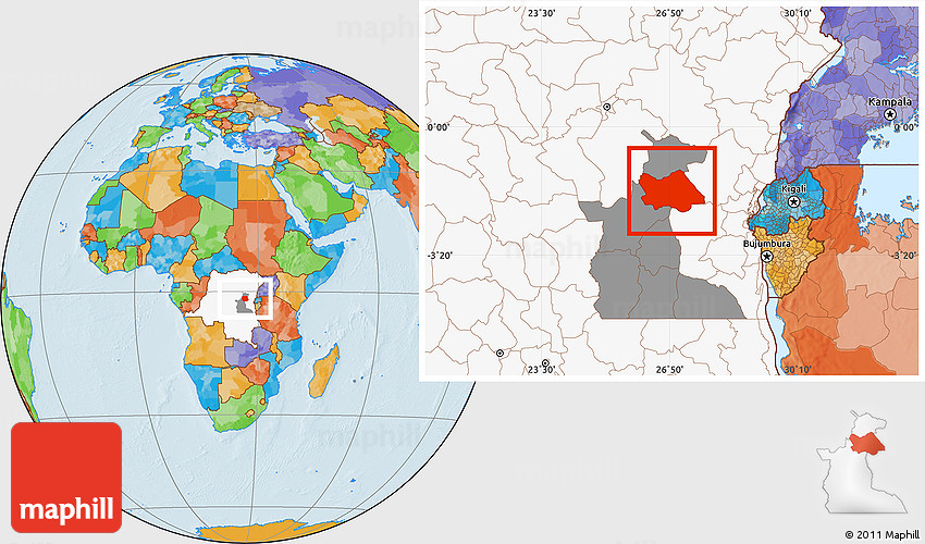 Maphill is a collection of map images. This image combines a political map with the globe centered on Punia. Use the buttons under the image to switch to different map types.