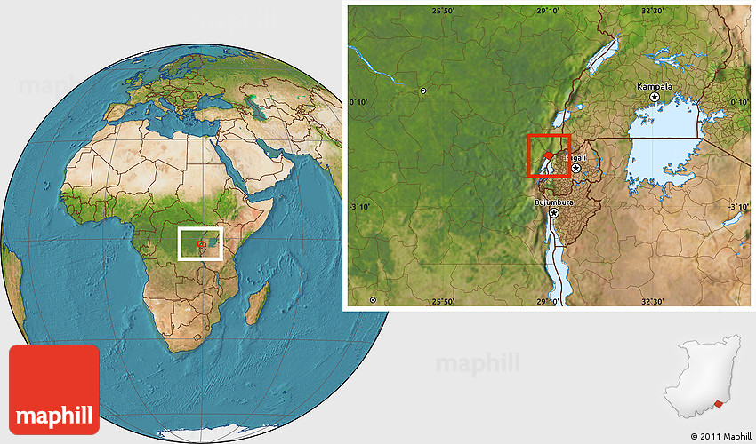 Maphill is a collection of map images. This image combines a satellite map with the globe centered on Goma. Use the buttons under the image to switch to different map types.