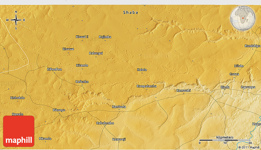 The 3D physical map represents one of many map types and styles available. Look at Kamwabi, Kamina, Haut-Lomami, Shaba, Democratic Republic of the Congo from different perspectives.