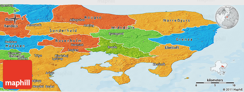 The panoramic physical map represents one of several map types and styles available. Look at Ronde, Arhus, Denmark from different perspectives.