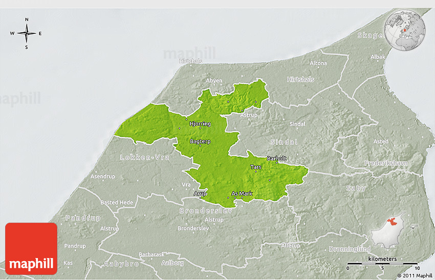 Physical map illustrates the mountains, lowlands, oceans, lakes and rivers and other physical landscape features of Hjorring. Differences in land elevations relative to the sea level are represented by color.
