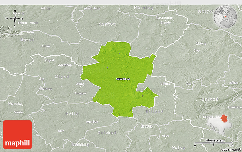Physical map illustrates the mountains, lowlands, oceans, lakes and rivers and other physical landscape features of Grindsted. Differences in land elevations relative to the sea level are represented by color.
