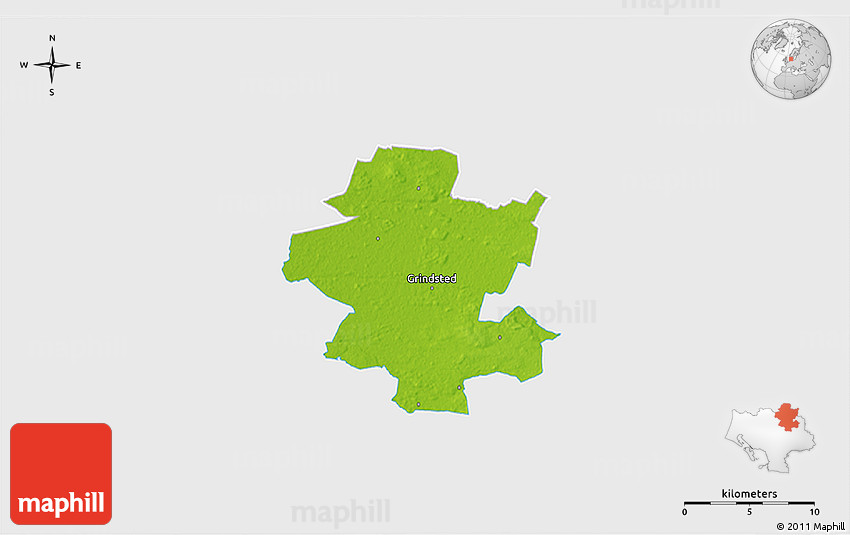 Physical map illustrates the mountains, lowlands, oceans, lakes and rivers and other physical landscape features of Grindsted. Differences in land elevations relative to the sea level are represented by color.