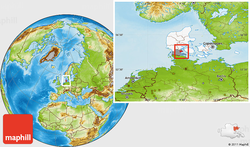 Maphill is a collection of map images. This image combines a physical map with the globe centered on Haderslev. Use the buttons under the image to switch to different map types.