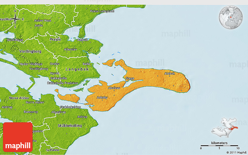 The 3D political map represents one of several map types and styles available. Look at Mon, Storstrom, Denmark from different perspectives.