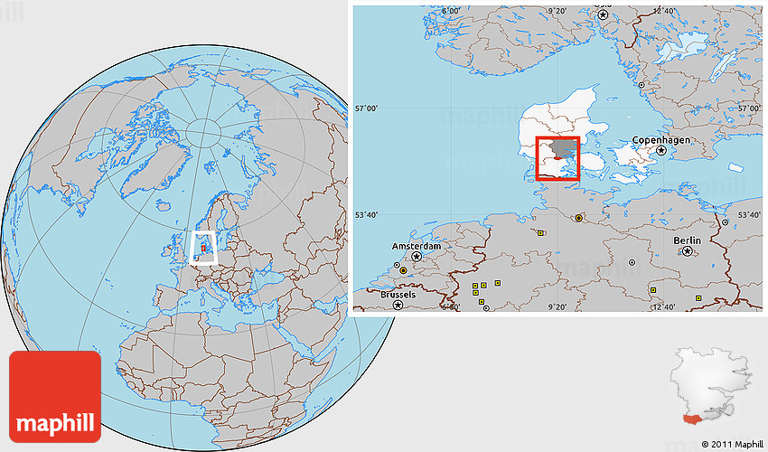Maphill is a collection of map images. This image combines a gray map with the globe centered on Vamdrup. Use the buttons under the image to switch to different map types.