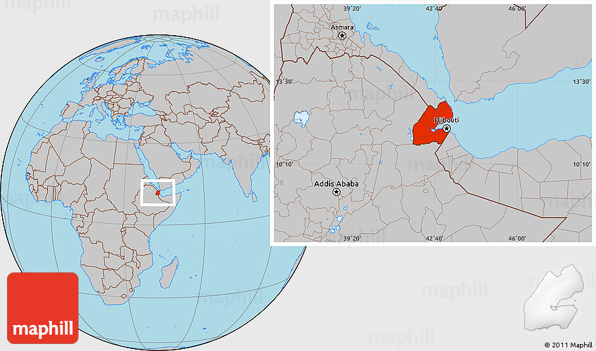 Maphill is a collection of map images. This image combines a gray map with the globe centered on Djibouti. Use the buttons under the image to switch to different map types.