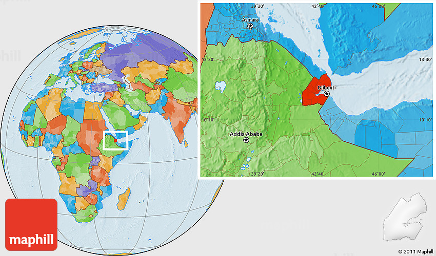 Maphill is a collection of map images. This image combines a political map with the globe centered on Djibouti. Use the buttons under the image to switch to different map types.