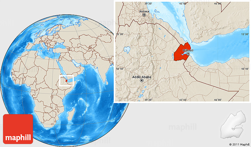 Maphill is a collection of map images. This image combines a shaded relief map with the globe centered on Djibouti. Use the buttons under the image to switch to different map types.