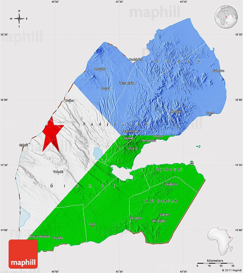 Maphill is a collection of map images. This flag map of Djibouti is one of them. Click on the Detailed button under the image to switch to a more detailed map.