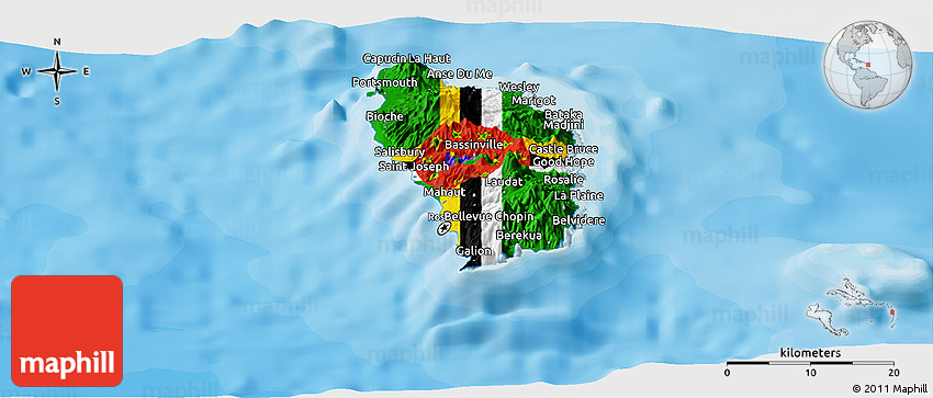 Physical map illustrates the mountains, lowlands, oceans, lakes and rivers and other physical landscape features of Dominica. Differences in land elevations relative to the sea level are represented by color.