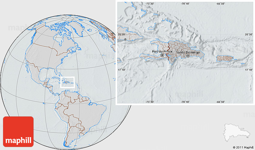 Maphill is a collection of map images. This image combines a gray map with the globe centered on Dominican Republic. Use the buttons under the image to switch to different map types.