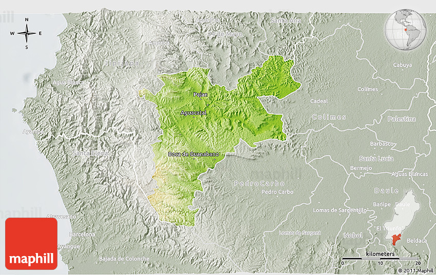 The 3D physical map represents one of several map types and styles available. Look at Pajan, Manabi, Ecuador from different perspectives.