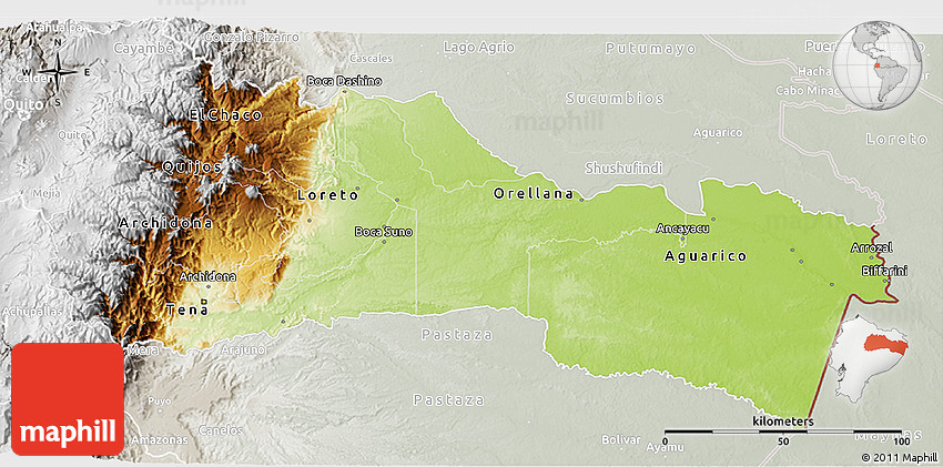 Physical map illustrates the mountains, lowlands, oceans, lakes and rivers and other physical landscape features of Napo. Differences in land elevations relative to the sea level are represented by color.