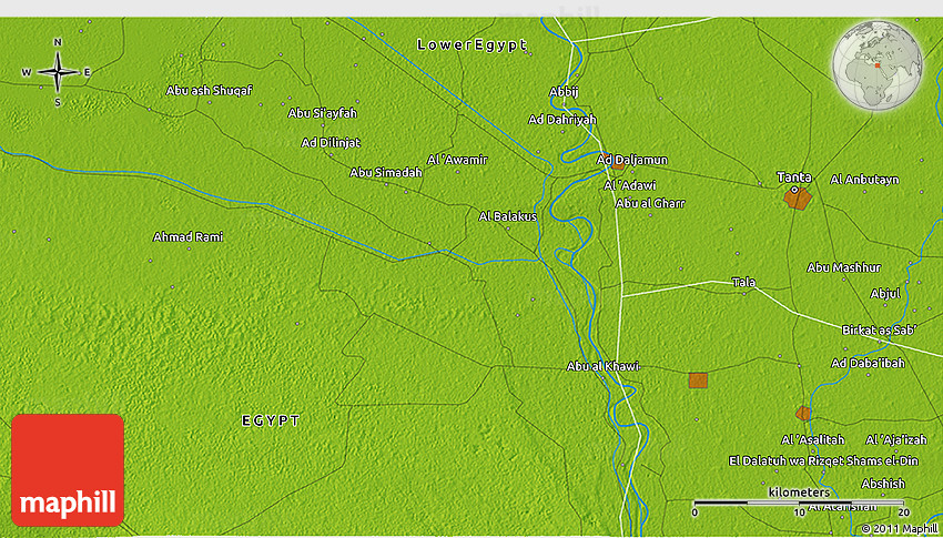 Physical map illustrates the mountains, lowlands, oceans, lakes and rivers and other physical landscape features of Shibīn al Kawm. Differences in land elevations relative to the sea level are represented by color.