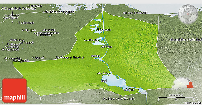 Physical map illustrates the mountains, lowlands, oceans, lakes and rivers and other physical landscape features of As Ismailiyah (Ismailia). Differences in land elevations relative to the sea level are represented by color.
