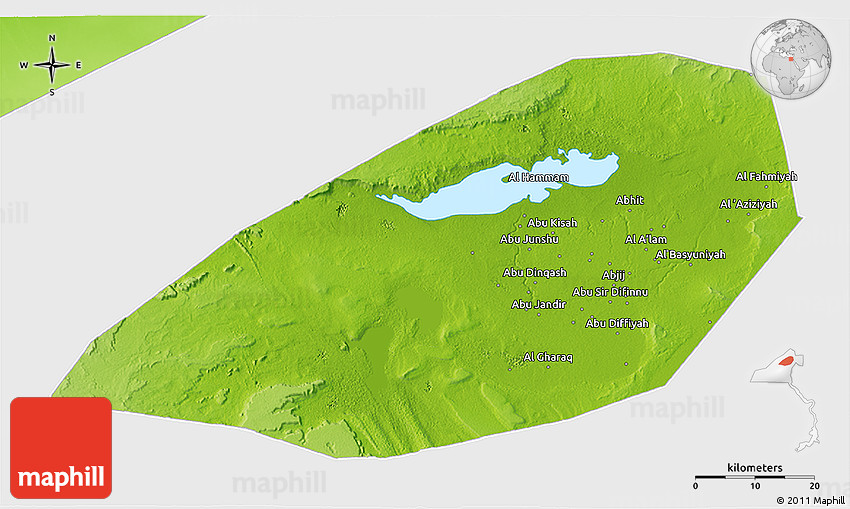 Physical map illustrates the mountains, lowlands, oceans, lakes and rivers and other physical landscape features of Al Fayyum (Fayoum). Differences in land elevations relative to the sea level are represented by color.