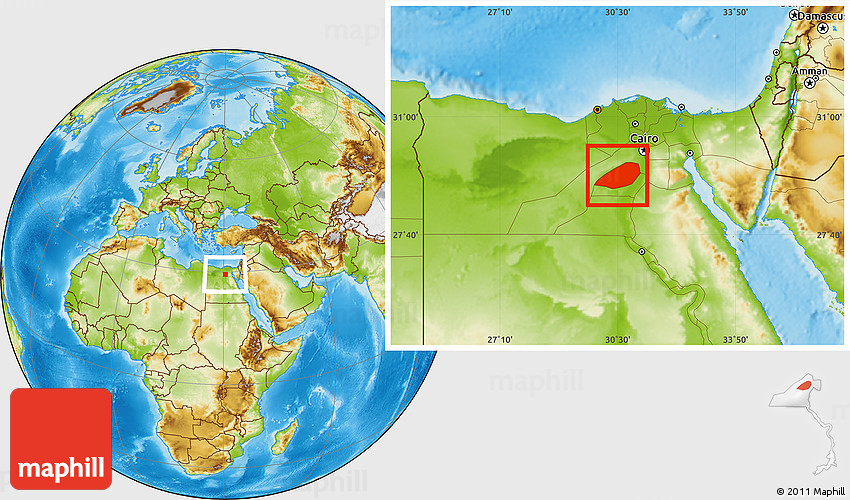 Maphill is a collection of map images. This image combines a physical map with the globe centered on Al Fayyum (Fayoum). Use the buttons under the image to switch to different map types.