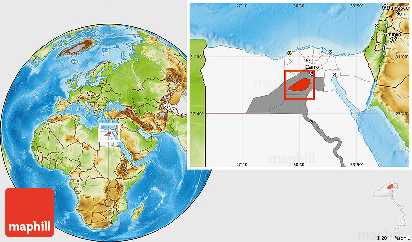 Maphill is a collection of map images. This image combines a physical map with the globe centered on Al Fayyum (Fayoum). Use the buttons under the image to switch to different map types.