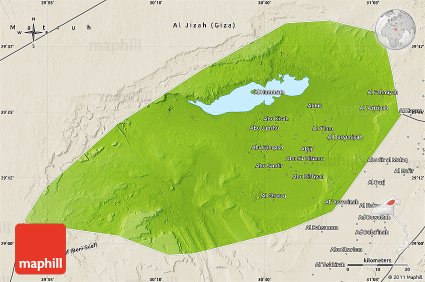 Physical map illustrates the mountains, lowlands, oceans, lakes and rivers and other physical landscape features of Al Fayyum (Fayoum). Differences in land elevations relative to the sea level are represented by color.