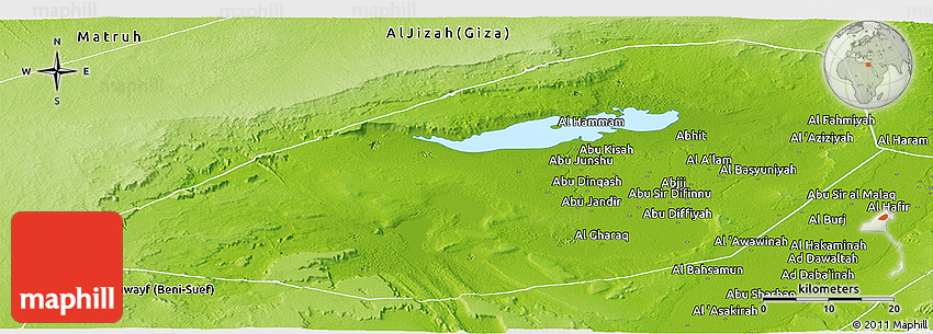 The panoramic physical map represents one of several map types and styles available. Look at Al Fayyum (Fayoum), Upper Egypt, Egypt from different perspectives.