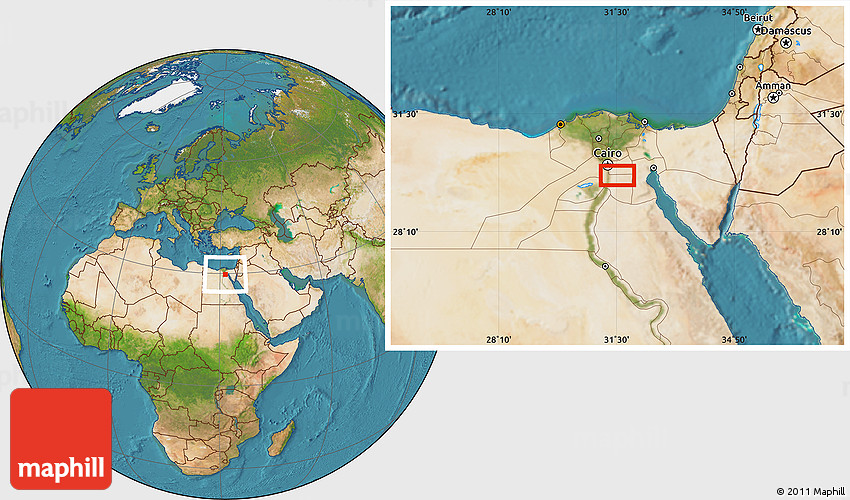 Maphill is a collection of map images. This image combines a satellite map with the globe centered on Al Qal`ah. Use the buttons under the image to switch to different map types.