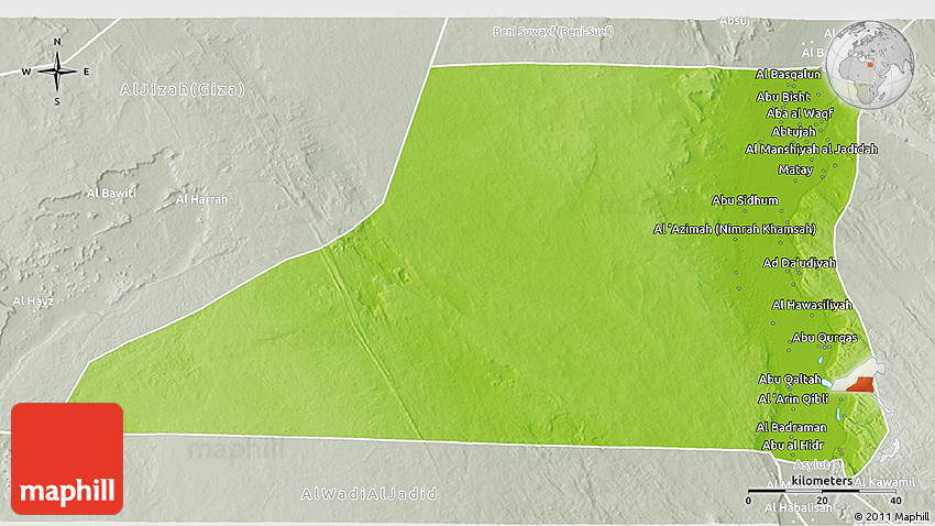 Physical map illustrates the mountains, lowlands, oceans, lakes and rivers and other physical landscape features of Al Minya (Menia). Differences in land elevations relative to the sea level are represented by color.