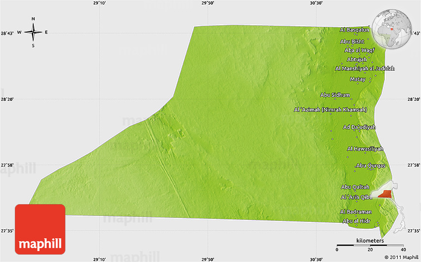 Physical map illustrates the mountains, lowlands, oceans, lakes and rivers and other physical landscape features of Al Minya (Menia). Differences in land elevations relative to the sea level are represented by color.