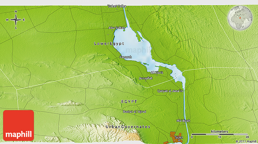 The 3D physical map represents one of many map types and styles available. Look at Basţat al `Ajrūd, As Suways (Suez), Urban Governates, Egypt from different perspectives.
