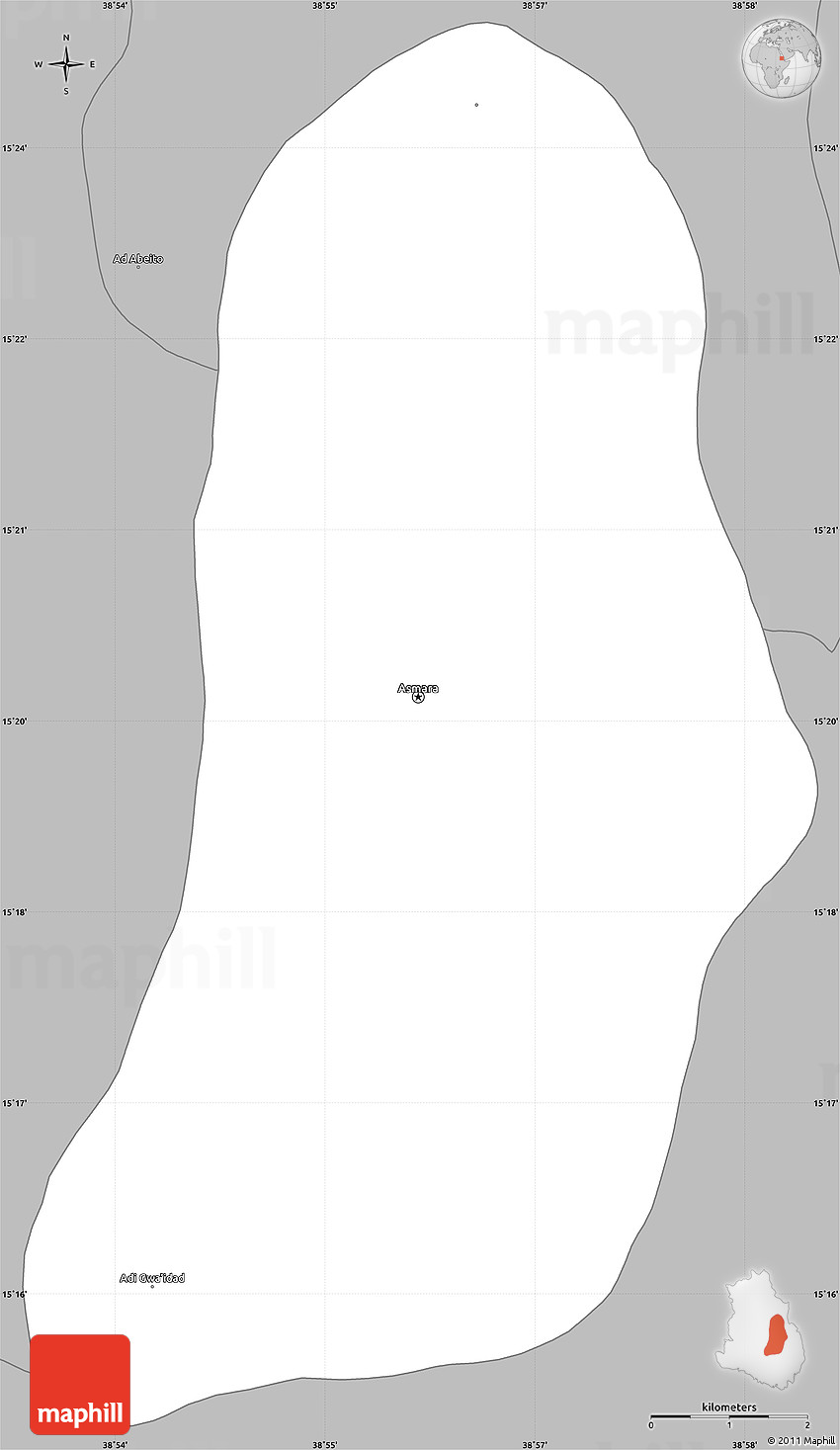 The simple gray outline map represents one of several map types and styles available. Look at Asmara City, Makelay, Eritrea from different perspectives.