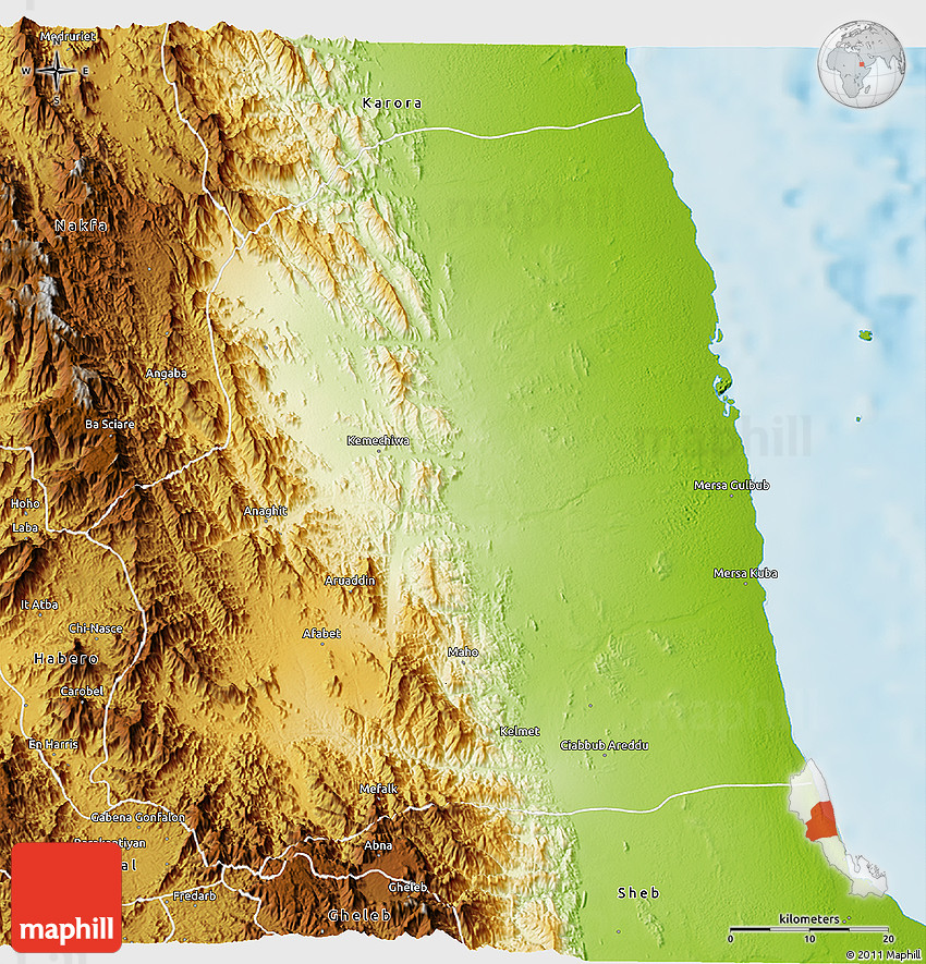 Physical map illustrates the mountains, lowlands, oceans, lakes and rivers and other physical landscape features of Afabet. Differences in land elevations relative to the sea level are represented by color.