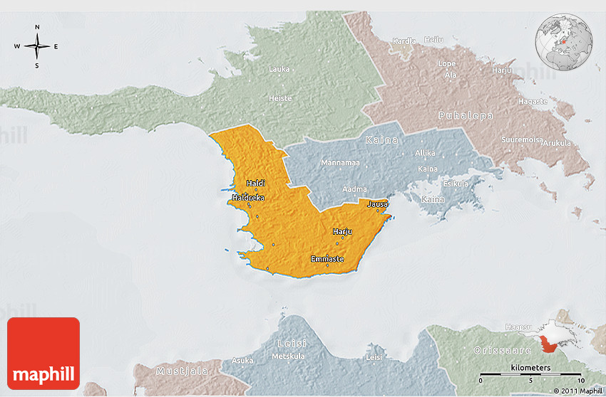 Each map type offers different information and each map style is designed for a different purpose. Read about the styles and map projection used in the above map (Political 3D Map of Emmaste, lighten, semi-desaturated).