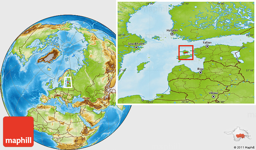 Maphill is a collection of map images. This image combines a physical map with the globe centered on Käina. Use the buttons under the image to switch to different map types.