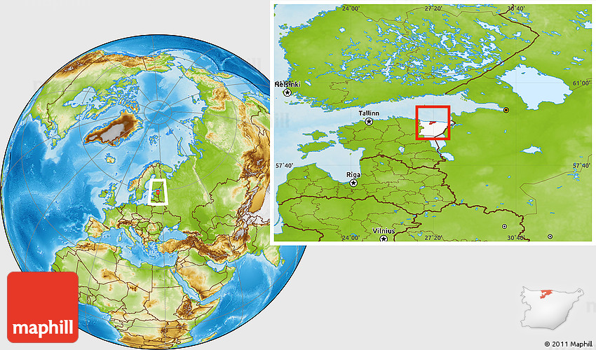 Maphill is a collection of map images. This image combines a physical map with the globe centered on Kohtla. Use the buttons under the image to switch to different map types.