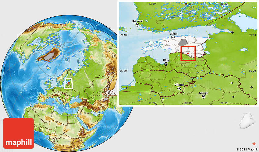 Maphill is a collection of map images. This image combines a physical map with the globe centered on Oru vald. Use the buttons under the image to switch to different map types.