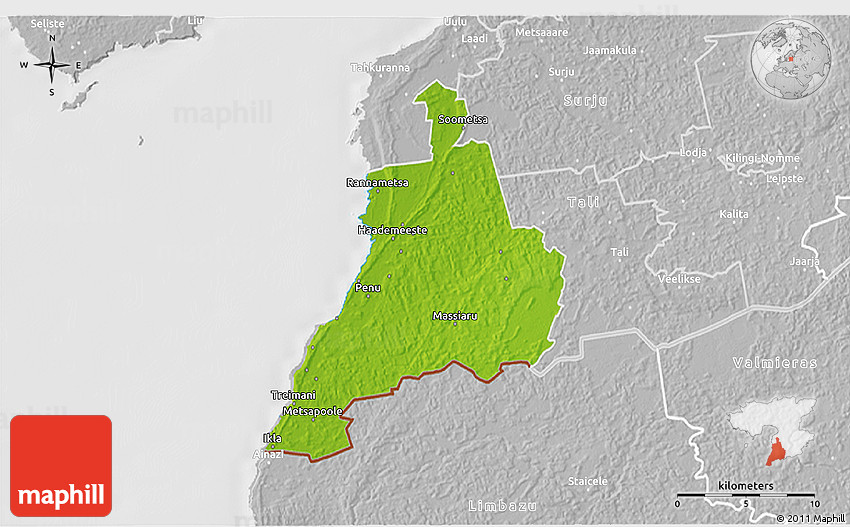 Physical map illustrates the mountains, lowlands, oceans, lakes and rivers and other physical landscape features of Häädemeeste. Differences in land elevations relative to the sea level are represented by color.