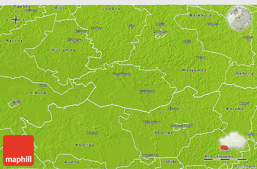 Physical map illustrates the mountains, lowlands, oceans, lakes and rivers and other physical landscape features of Vigala. Differences in land elevations relative to the sea level are represented by color.