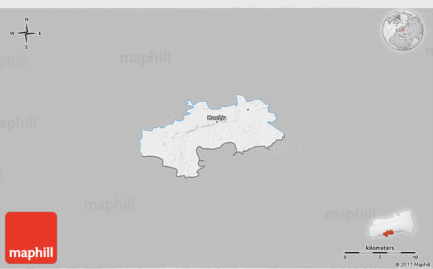 Each map type offers different information and each map style is designed for a different purpose. Read about the styles and map projection used in the above map (Gray 3D Map of Kambja, single color outside).