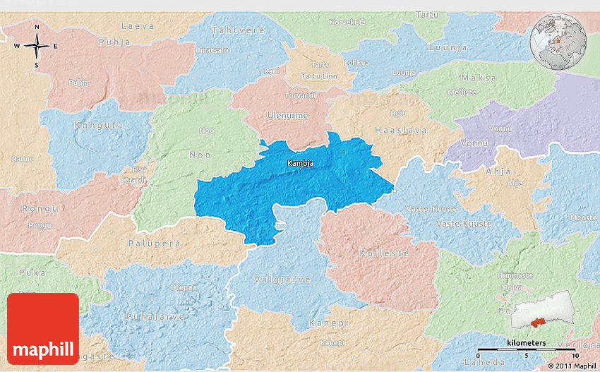 The 3D political map represents one of several map types and styles available. Look at Kambja, Tartu, Estonia from different perspectives.