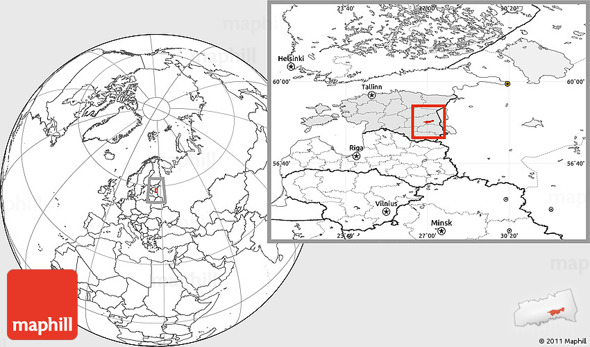 The location map of Mäksa combines two projections: the orthographic azimuthal projection for the globe and the simple geographic projection for the rectangular part of the map. Geographic projection has straight meridians and parallels, each degree of latitude and longitude is the same size over the entire world map.