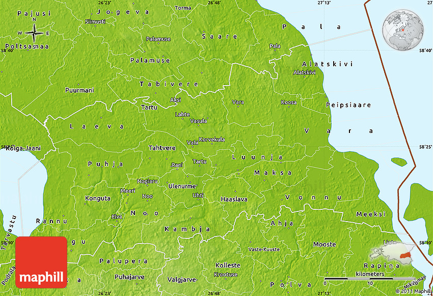 Physical map illustrates the mountains, lowlands, oceans, lakes and rivers and other physical landscape features of Tartu. Differences in land elevations relative to the sea level are represented by color.