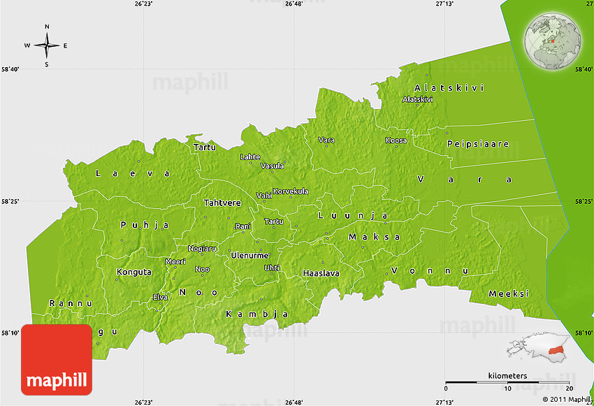 Physical map illustrates the mountains, lowlands, oceans, lakes and rivers and other physical landscape features of Tartu. Differences in land elevations relative to the sea level are represented by color.
