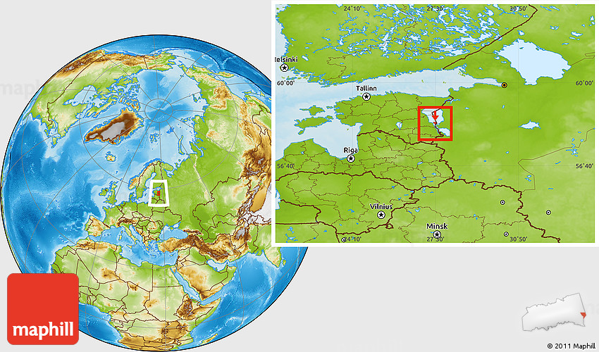 Maphill is a collection of map images. This image combines a physical map with the globe centered on Piirissaar. Use the buttons under the image to switch to different map types.