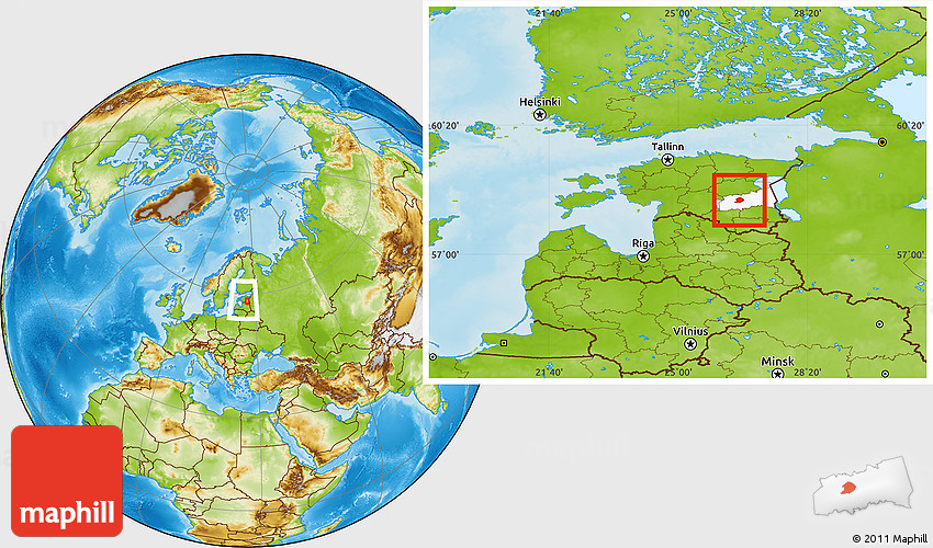 Maphill is a collection of map images. This image combines a physical map with the globe centered on Tähtvere. Use the buttons under the image to switch to different map types.