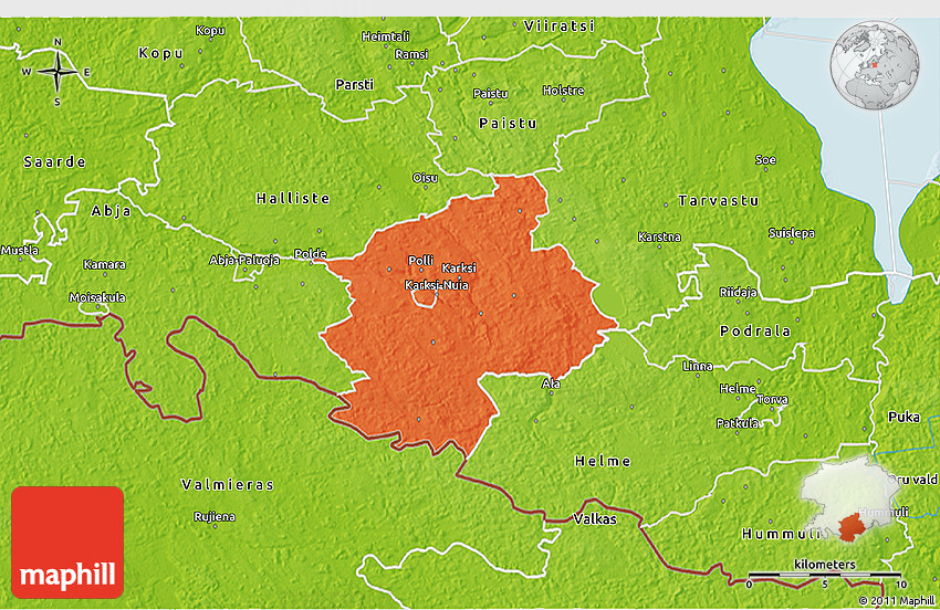 Physical map illustrates the mountains, lowlands, oceans, lakes and rivers and other physical landscape features of Karksi. Differences in land elevations relative to the sea level are represented by color.