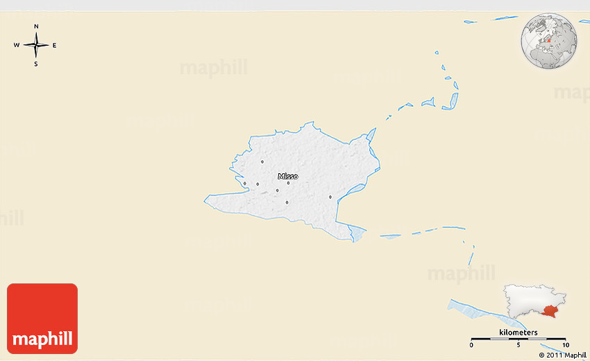 This map uses colors of vintage antique maps. Misso is highlighted with white. The rest of the map is beige colored shaded relief map.
