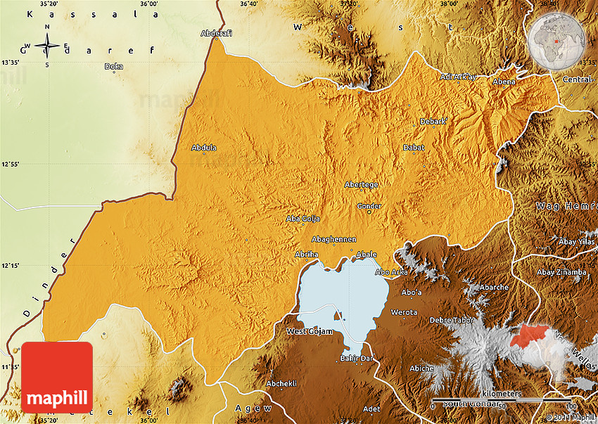 Physical map illustrates the mountains, lowlands, oceans, lakes and rivers and other physical landscape features of North Gonder. Differences in land elevations relative to the sea level are represented by color.