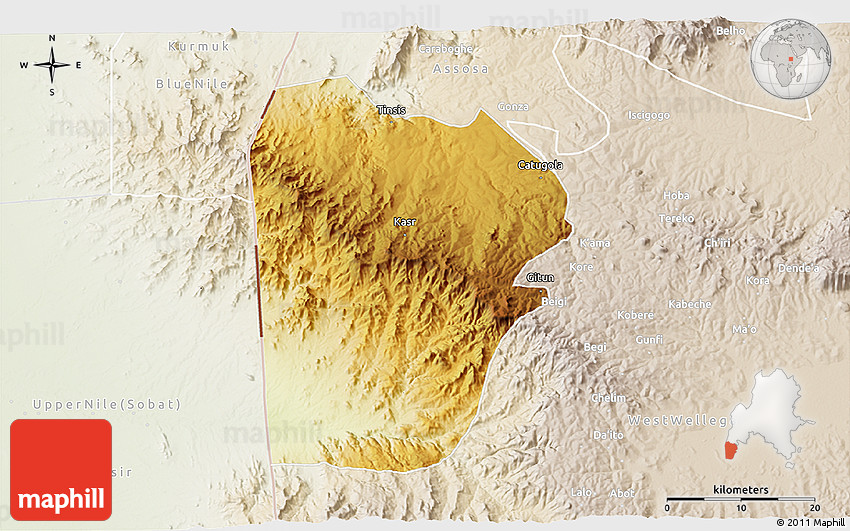 The 3D physical map represents one of several map types and styles available. Look at Bebieg, Benshangul, Ethiopia from different perspectives.